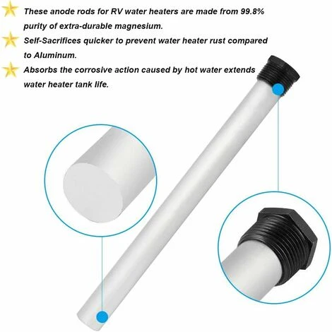 Matériau de sécurité : ces tiges d’anode pour chauffe-eau de camping-car sont fabriquées à partir de 99,8 % de magnésium extra durable. Non toxique, sans danger pour le corps humain. Par rapport à l’aluminium (un matériau commun pour les tiges d’anode