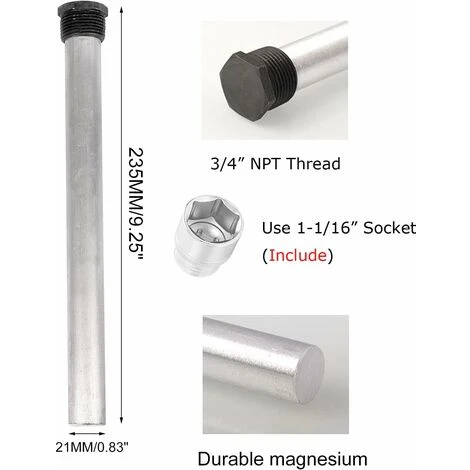 Compatibilité : ces tiges d’anode en magnésium mesurent 23,5 cm de long, sont livrées avec des filetages NPT de 1,9 cm, et sont compatibles avec les réservoirs d’eau et Mor-Flo. Les tiges utilisent une douille de 1 1/16″. Non compatible avec un filetage