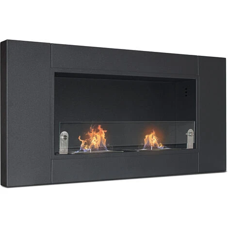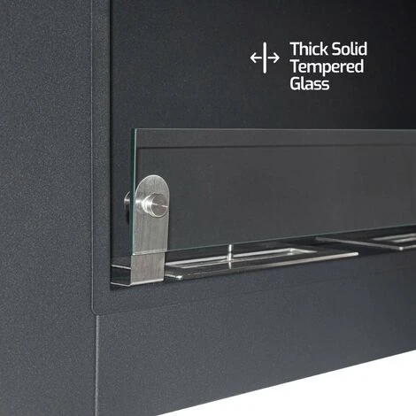 Cheminée au bioéthanol encastrée, fabriquée en acier inoxydable et en verre trempé, et finie avec une peinture résistant aux hautes températures.
