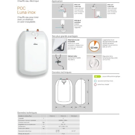 POC.G-5 Luna inox – Chauffe-eau pour évier avec un réservoir en acier inoxydable – 2000W / 230V – 5L