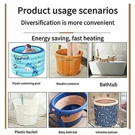 Répondez à vos différents besoins : profitez d’un bain super confortable par temps froid, ou utilisez notre radiateur pour faire bouillir de l’eau et tremper vos pieds pendant la nuit pour vous garder au chaud. Conteneurs applicables : baignoire, seau en plastique, piscine gonflable, baignoire pour les pieds.