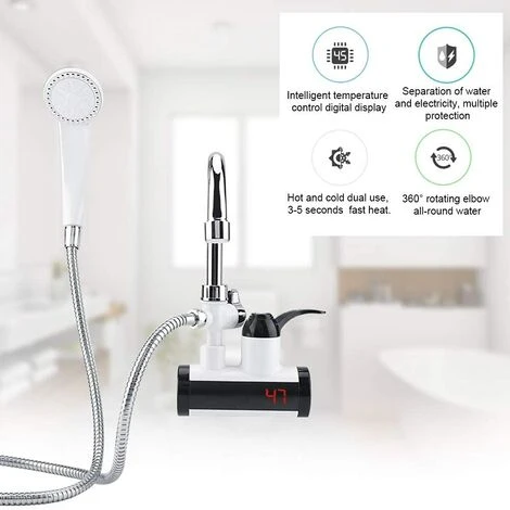This is a high quality instant water heater faucet tap. Made of high quality ABS, it’s tough and durable. Elegant color and stylish design make it a great decor for your kitchen. Robinet à col de cygne à rotation à 360 °.3 seconds fast heat! You canwash face and brush teeth with warm water every morning.