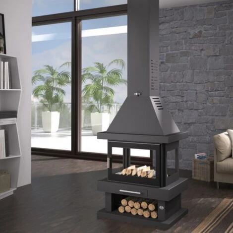 Fabriqué en acier de 4mm, double hotte, foyer en vermiculite, 4 cotés vitrés, porte avec cordon céramique, porte et grille en fonte, clapet, peinture résistante jusqu’à 800ºC, verre résistant jusqu’à 750ºC, sortie des fumées supérieur de 200mm, cendrier amovible, réglage d’air primaire et secondaire, système vitres propre, double combustion, bûcher inférieur