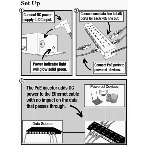Cet injecteur ne comprend pas d’alimentation électrique, vous pouvez le commander selon votre besoin ! Options d’alimentation voir POE-8-24V60W et POE-8-48V60W.