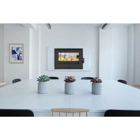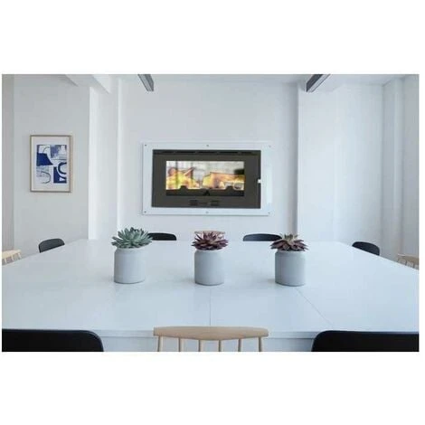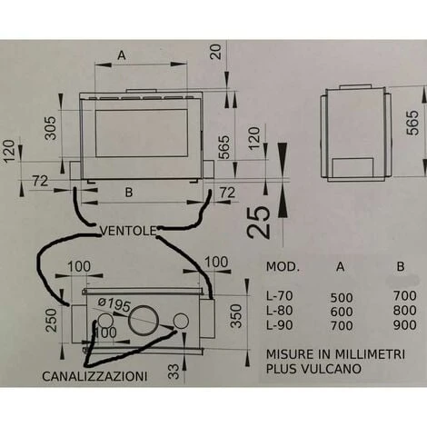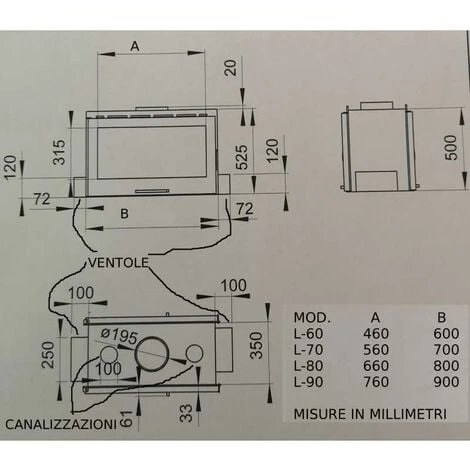 Insert de cheminée à bois ventilé gainable double face en acier épais S235JR, d’une puissance thermique nominale de 18kw et d’un rendement de 70% avec une autonomie approuvée de 8 heures, conformément à la norme européenne EN 13229; équipé d’un verre céramique de 4 mm pour les hautes températures, d’un cendrier amovible et d’un régulateur d’air de combustion à l’avant. Dimension 90x52x46cm; dimensions intérieures du foyer 42x79cm; profondeur utile 33cm. Modèle L-90 Ligne bifaciale caractérisée par une porte vitrée sur deux côtés, particulièrement adaptée pour être placée dans un mur de séparation, marque F.lli Lerda