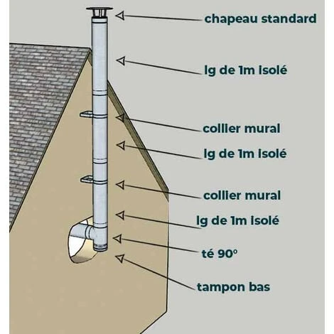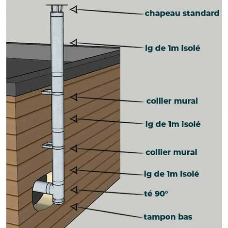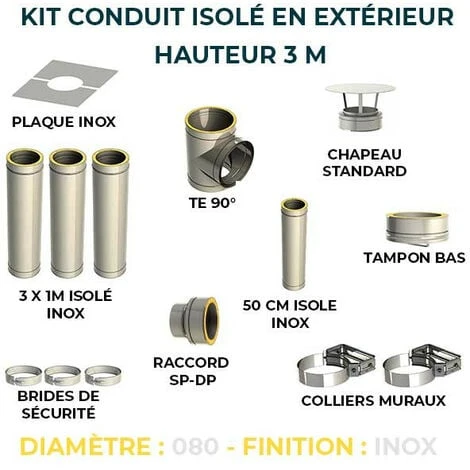 Retrouvez notre kit de fumisterie complet d’une hauteur de 3 mètres pour installer un conduit de cheminée à l’extérieur de votre maison (avec tous les accessoires pour la traversée et le maintien le long du mur extérieur).