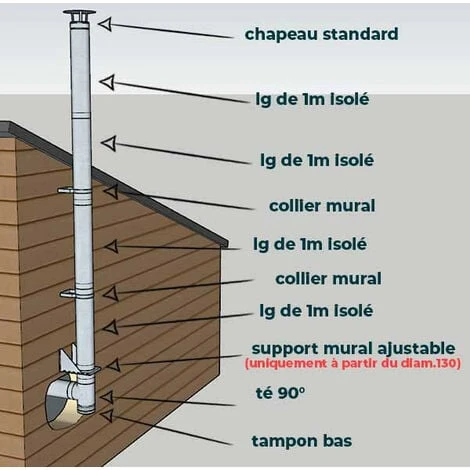 Retrouvez notre kit de fumisterie pour hauteur de 4 mètres pour installer un conduit de cheminée à l’extérieur de votre maison (avec tous les accessoires pour la traversée et le maintien le long du mur extérieur).