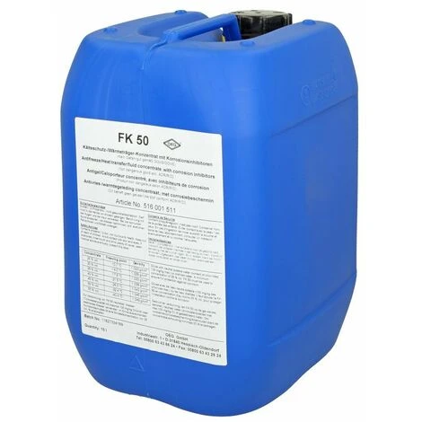 Le liquide caloporteur FK OEG convient à toutes les installations solaires à capteurs plats. Grâce à sa composition chimique, la chaleur produite est transmise de manière optimale par le circuit de l’installation solaire et peut donc être utilisée ultérieurement pour le chauffage de l’eau chaude sanitaire ou le chauffage d’appoint.En même temps, le liquide protège vos capteurs solaires du gel et de la corrosion. En outre, le liquide peut également être utilisé dans les systèmes de chauffage et de refroidissement dans les secteurs de l’alimentation et de l’eau potable. Le liquide est fourni sous forme de concentré avec une efficacité antigel de -50 °C.Indication:Peut être mélangé avec Tyfocor®L, n° art. OEG 516001512 ou 516001510Le concentré est plus économique que les produits conventionnels.