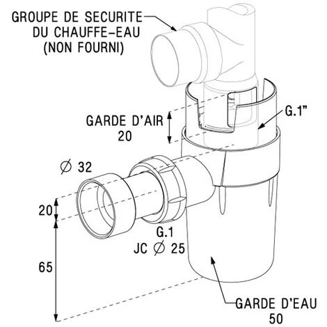 - Siphon pour groupe de sécurité G1ËxG11/4Ë, non réglable en hauteur, sortie 1 – Ø25mm+ douille Ø32mm, universel toutes marques.