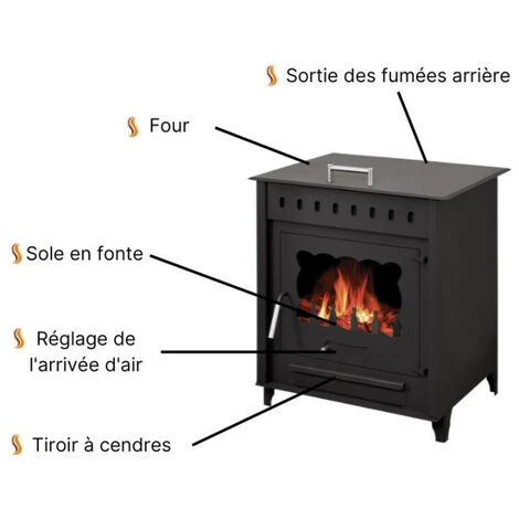 Il possède une sole en fonte, un tiroir de décendrage pour le nettoyage et un four sur la partie haute. Les boutons et les poignées ont été fabriqués en acier inoxydable pour une durée de vie plus longue et une sécurité garantie.
