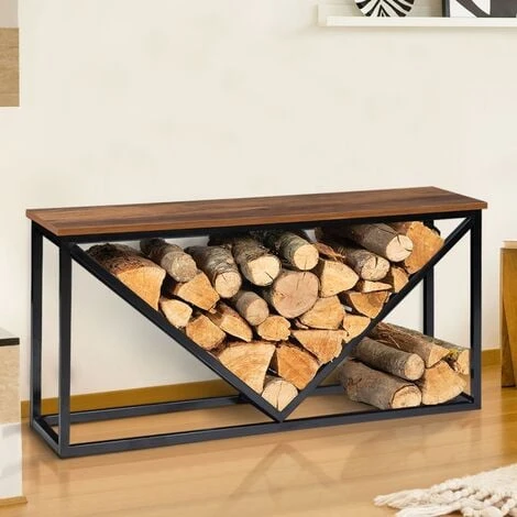 Range Bûches Horizontal DAYTON Acier Noir Plateau Bois Vieilli Pour Cheminée
