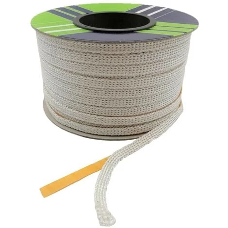 Tresse de verre plate blanche avec une face autocollante utilisée principalement pour l’isolation et l’étanchéité des portes de ramonage, de cendrier des poêles de masse, poêles à bois, cheminées, inserts…. et de tout autre élément où la température ne dépasse pas 160 ° (résistance maximale de la partie adhésive).